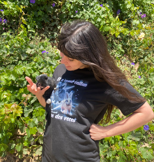¡Vuelve a los 2000 con estilo! Nuestra polera negra combina vibes retro y ternura con un diseño brillante de conejitos que dice: 'El que come callao, come dos veces'. Ideal para los amantes de los conejos y la nostalgia.