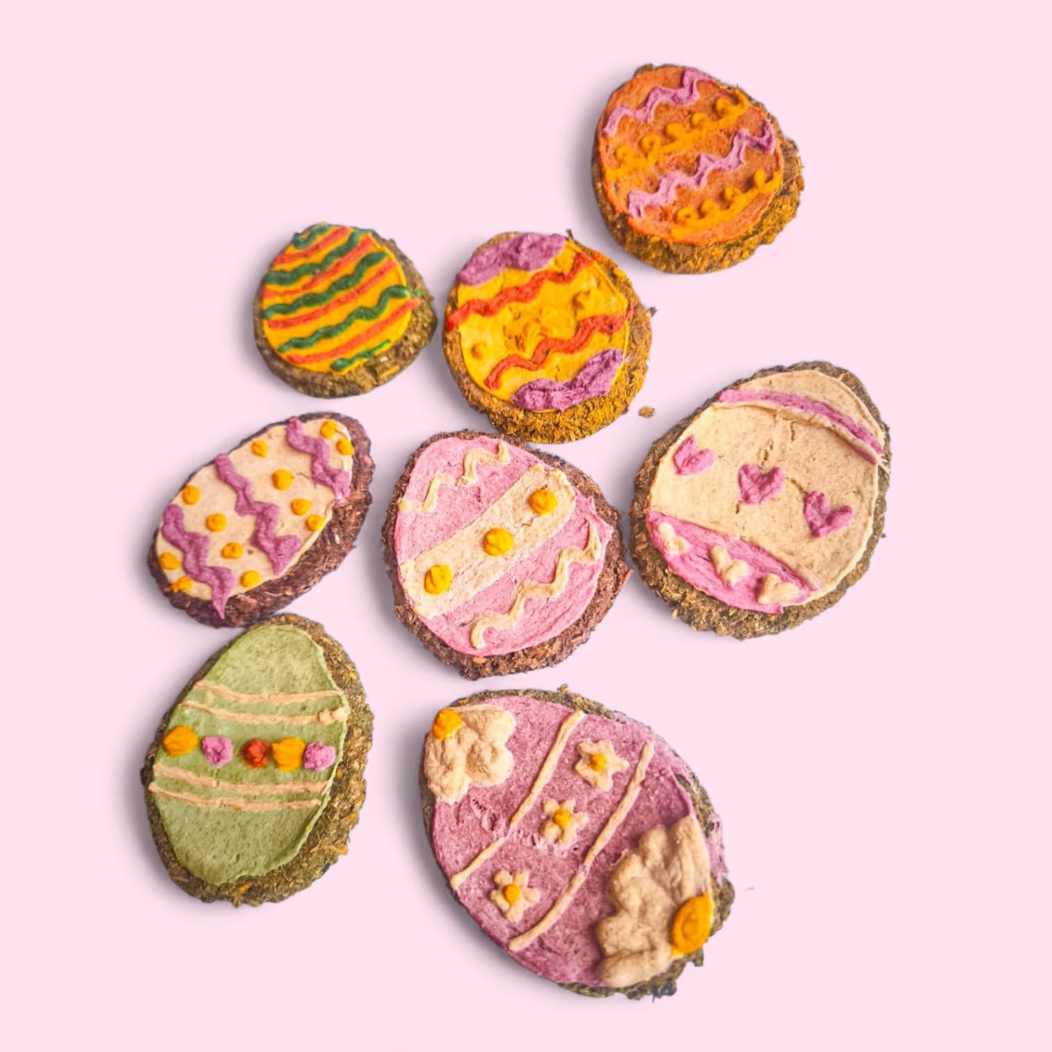 Dale a tu gordito una Pascua llena de color con las Color Egg, galletitas artesanales en forma de huevito, hechas con ingredientes naturales y llenas de sabor. 🌿✨ Su base de ballica, plátano y avena se combina con betarraga, cúrcuma y espirulina, logrando colores vibrantes sin necesidad de colorantes artificiales. 🎭🌈