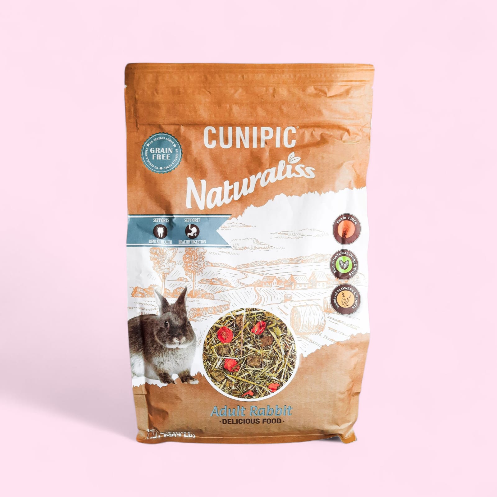 A esto se suma un 30% de heno salvaje de las montañas del Pirineo, libre de pesticidas y perfecto para el desgaste dental, más un 10% de flores y plantas silvestres que añaden frescura, aroma y variedad a su dieta. Sin colorantes ni conservantes artificiales, es una mezcla equilibrada y natural que tu conejo amará de principio a fin.